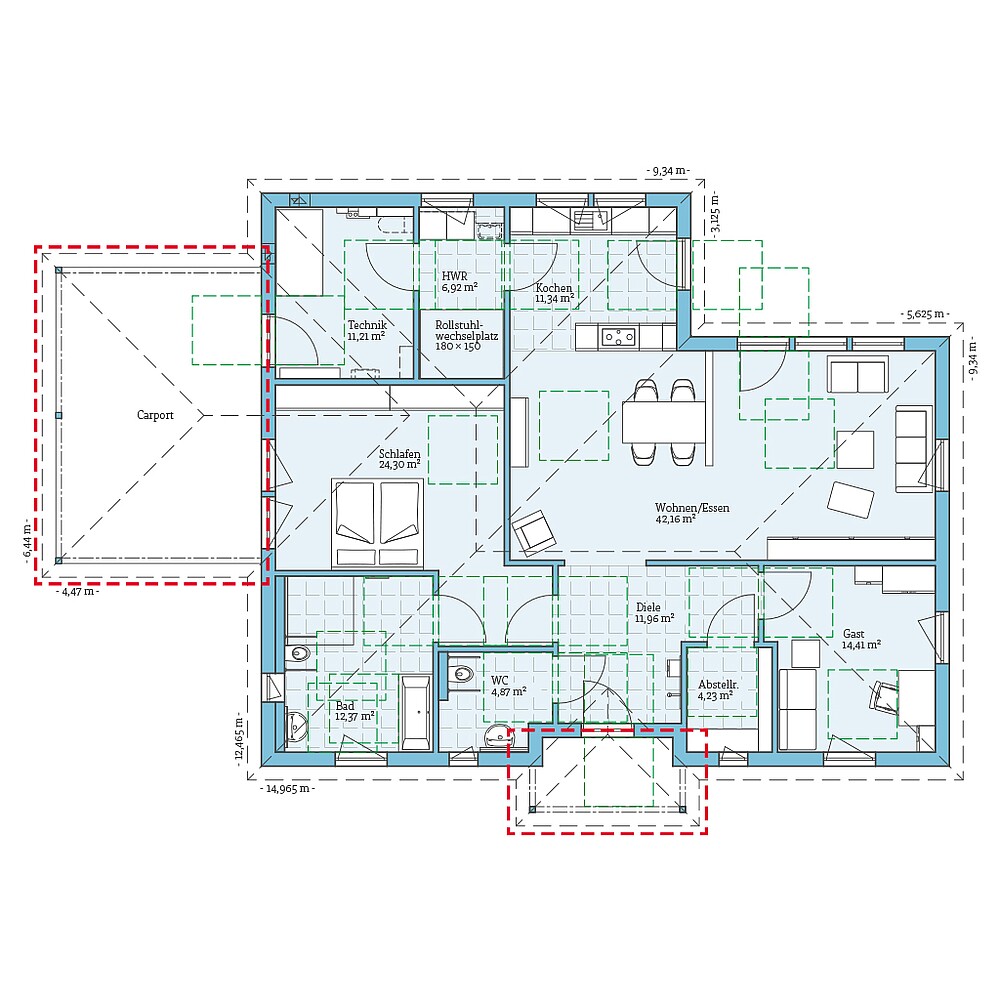 Gerade im Hinblick auf komfortables und barrierefreies Wohnen im Alter bietet sich z. B. das Raumkonzept des Bungalow 139 mit Walmdach an.