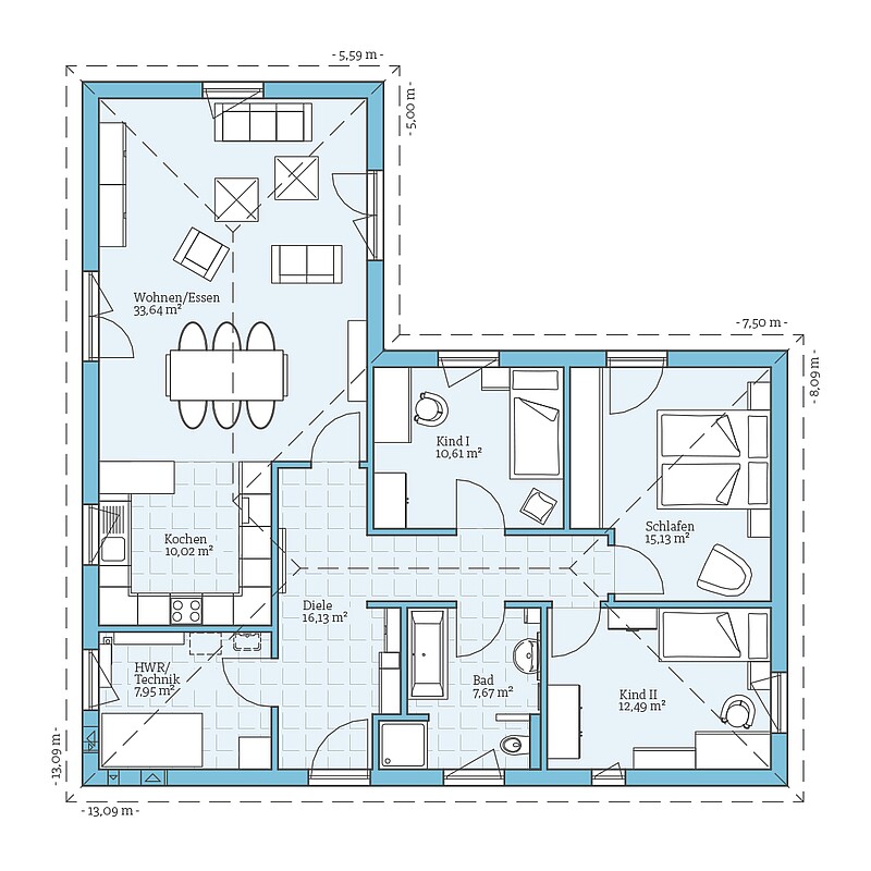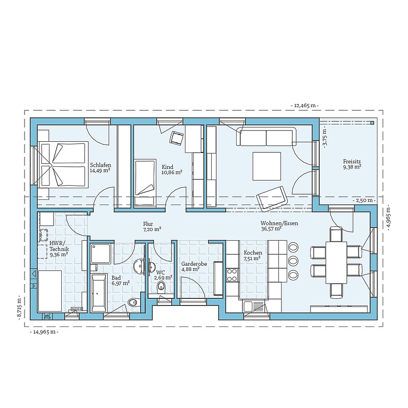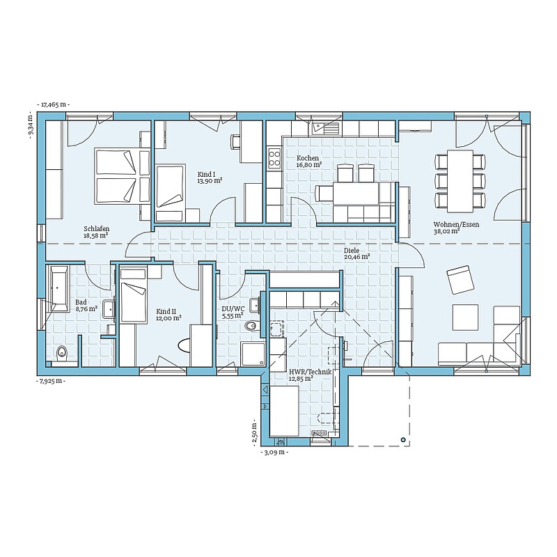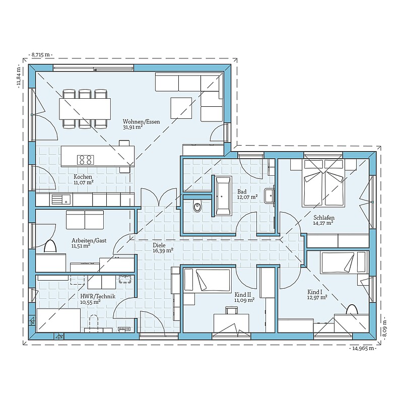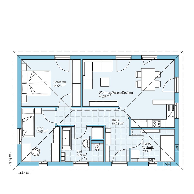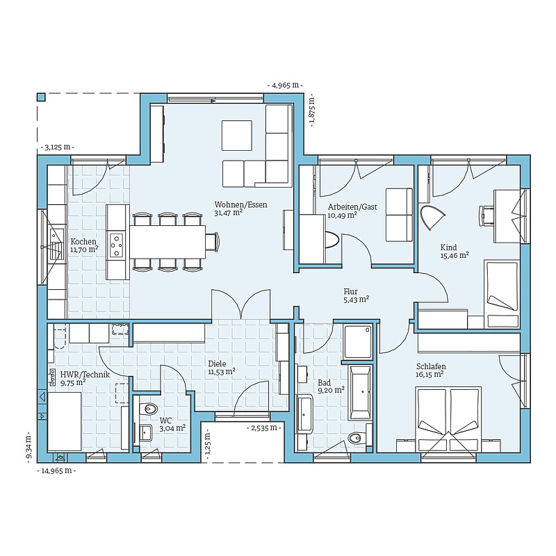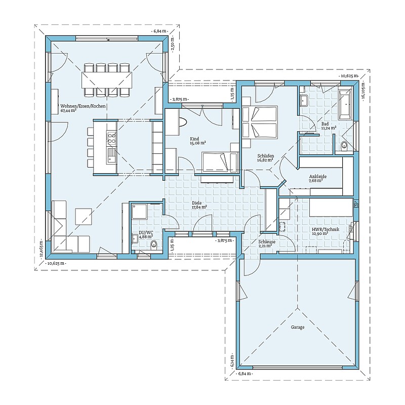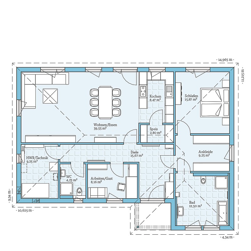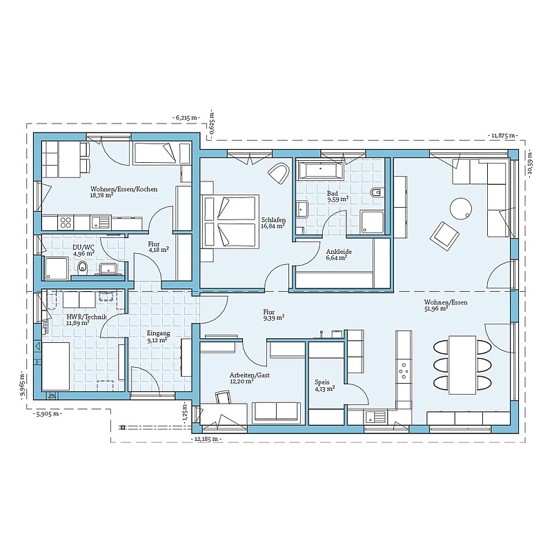 Bungalow-Grundriss mit 124 m² Grundfläche