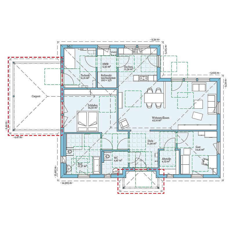 - Falls Sie einen Bungalow im Hinblick auf das Wohnen im Alter planen, denken Sie daran, dass alle Räume komfortabel mit dem Rollstuhl erreicht werden müssen, die Türen entsprechend breit sind und auch Terrassentüren barrierefrei zu öffnen sind.