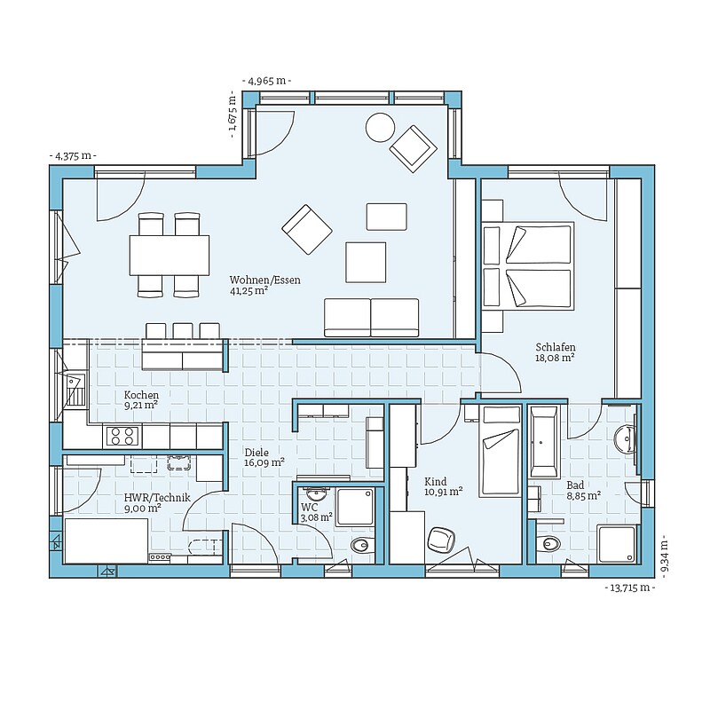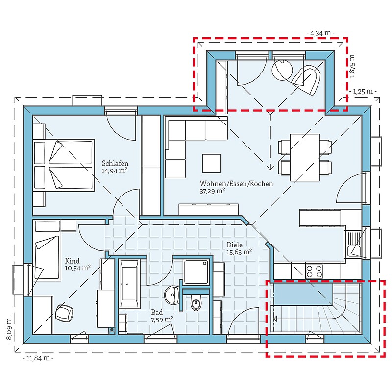 - Außerdem ist die Aufteilung der Räume variabler und die Lebensbereiche können räumlich besser voneinander getrennt werden.