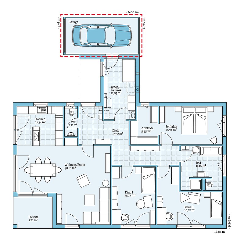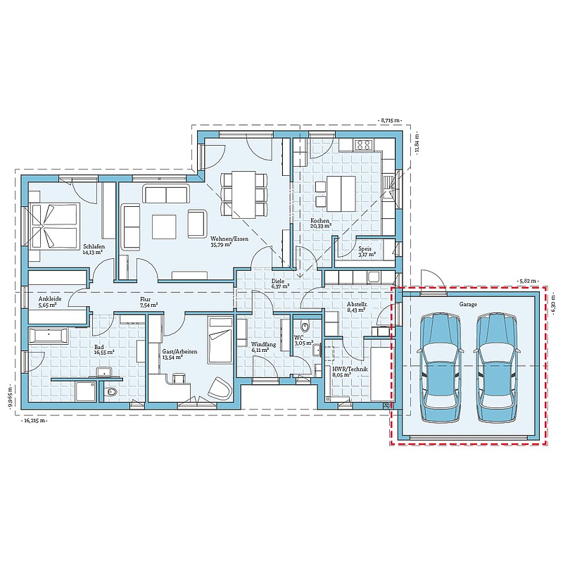 Bungalow-Grundriss mit 182 m² Grundfläche – Planungsoption mit Garage