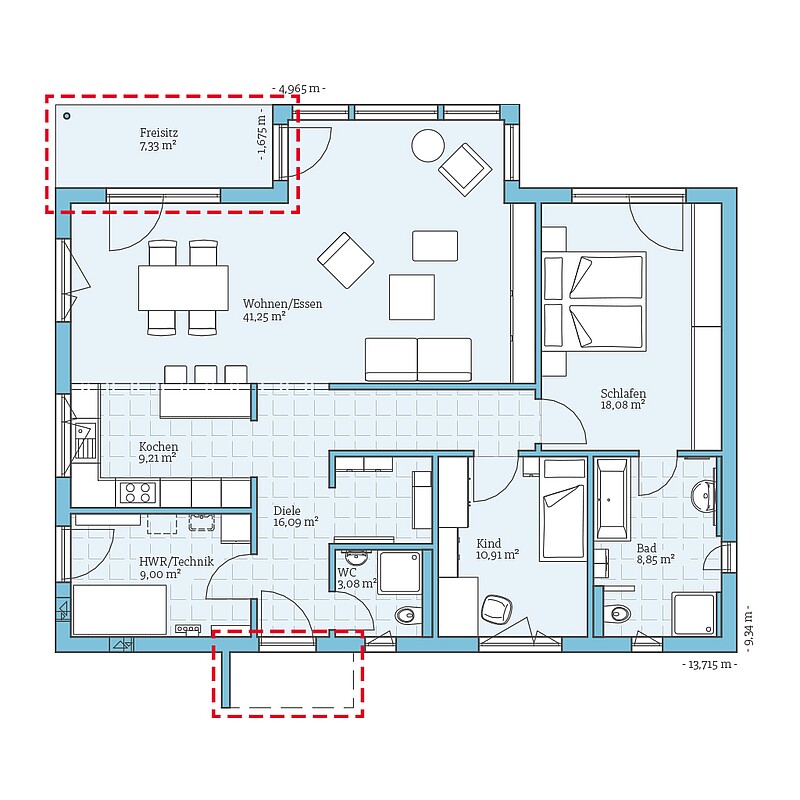 Bungalow-Grundriss mit 126 m² Grundfläche – Planungsoption mit überdachtem Freisitz