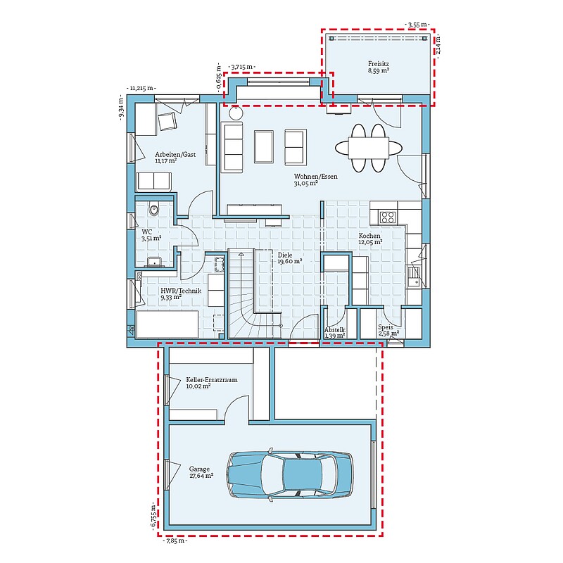 Einfamilienhaus-Grundrisse mit 197 m² Grundfläche – Planungsoption überdachter Freisitz, Küchenanbau & Carport