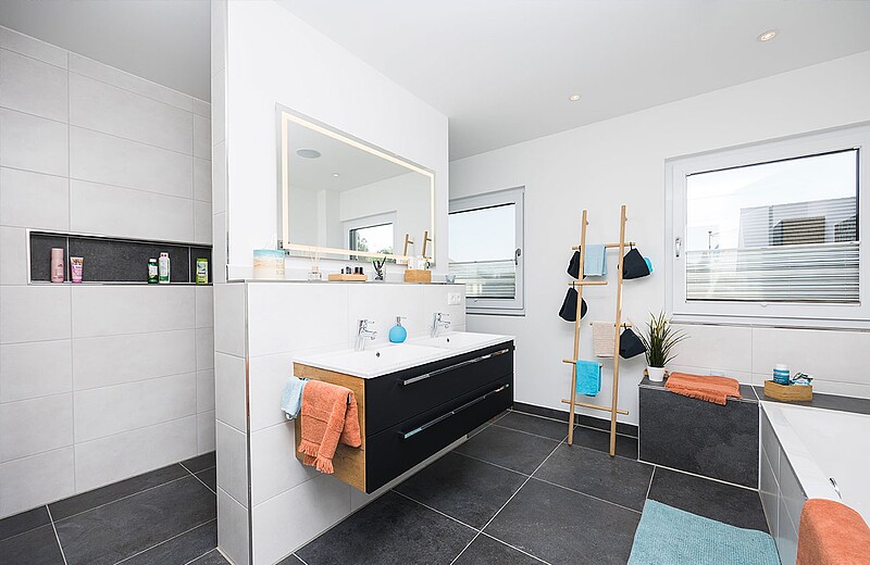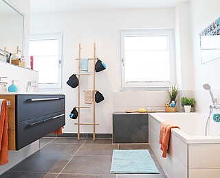 Damit die ganze Familie morgens pünktlich zur Arbeit oder in die Schule kommt, bedarf es einer geschickten Badezimmerplanung: Ideal sind mehrere Bäder, zum Beispiel ein großes Badezimmer und ein zusätzliches Duschbad, verteilt auf verschiedene Geschosse. Doppelwaschtische oder mehrere unabhängig nutzbare Toiletten können die Lage im Bad weiter entspannen. Halbhohe Wände oder die T-Lösung sorgen zudem für mehr Privatsphäre.