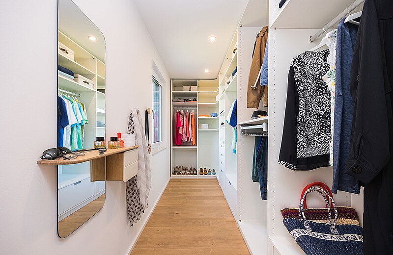 Auch ein abgetrennter Elternbereich, für den zuvor wegen der benötigten Kinderzimmer nicht genug Platz zur Verfügung stand, kann nach dem Auszug eines oder mehrerer Kinder umgesetzt werden. Wenn man beispielsweise die Wand zu einem an das Schlafzimmer angrenzenden Zimmer entfernt, kann dieses als Ankleidezimmer genutzt werden. Ist der Einbau einer Sauna eine Option, sollte das schon bei der Konzeption des Hauses mit eingeplant werden (z. B. ein Starkstromanschluss).