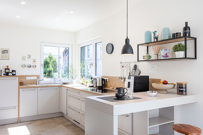 Im Erdgeschoss beeindruckt der mit fast 50 m² riesige Wohn- und Kochbereich. Seine großen Fensterflächen lassen auch im Winter wohltuende Sonnenstrahlen ins Haus und durchfluten den Raum mit Licht.
