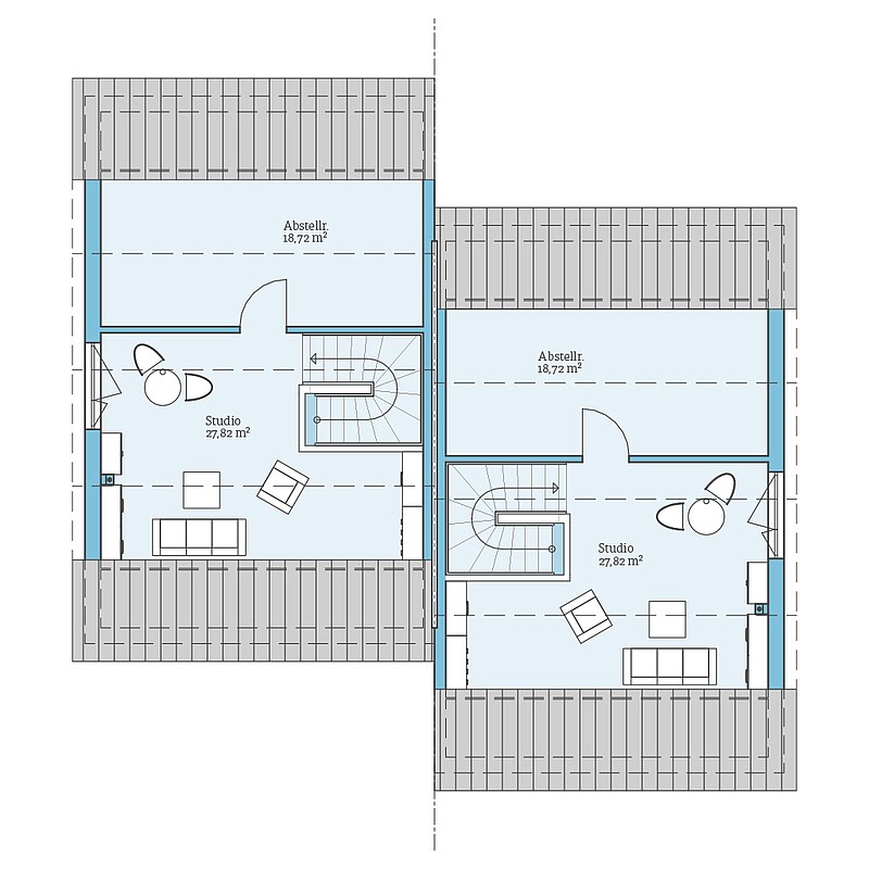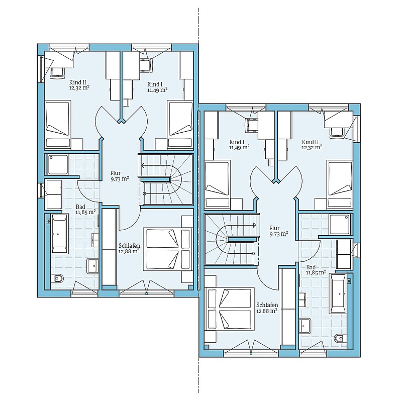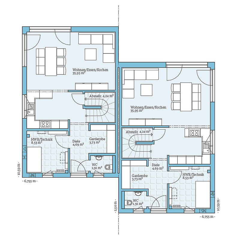 Beim Entwurf Doppelhaus 164 sind die beiden Haushälften nicht in einer Reihe, sondern versetzt angeordnet. Das ist oft eine gute Lösung, damit sich das Doppelhaus optimal in die Gegebenheiten auf den Grundstücken einfügt.