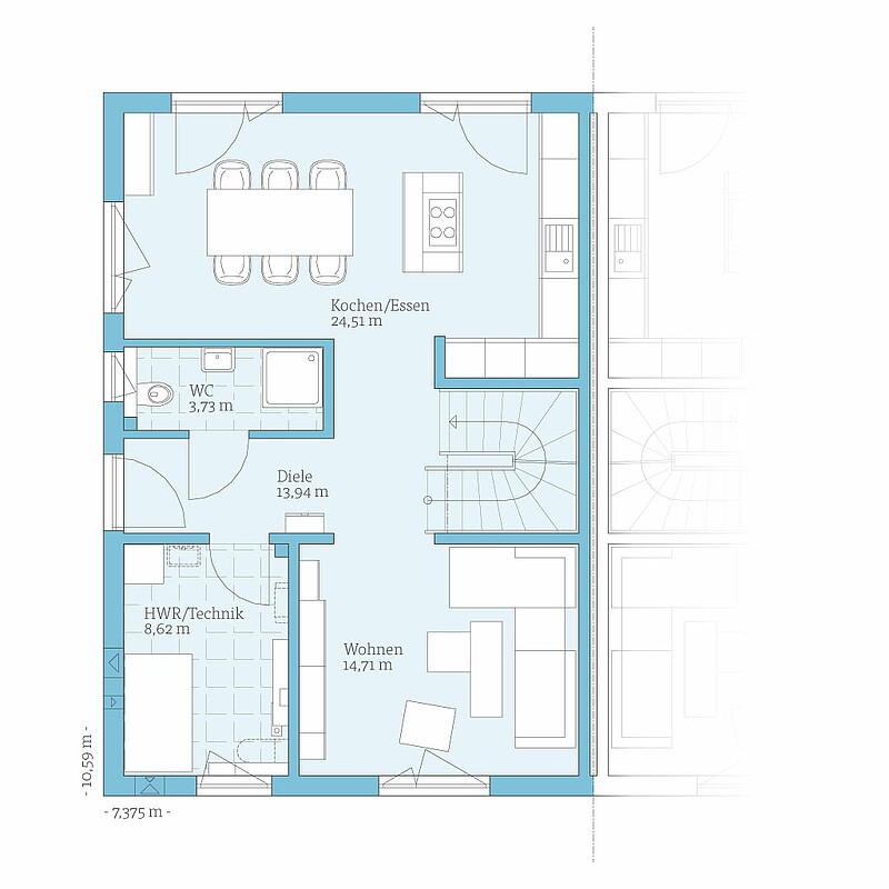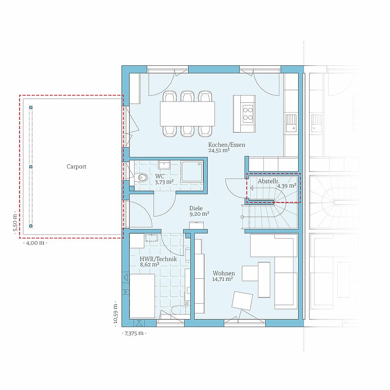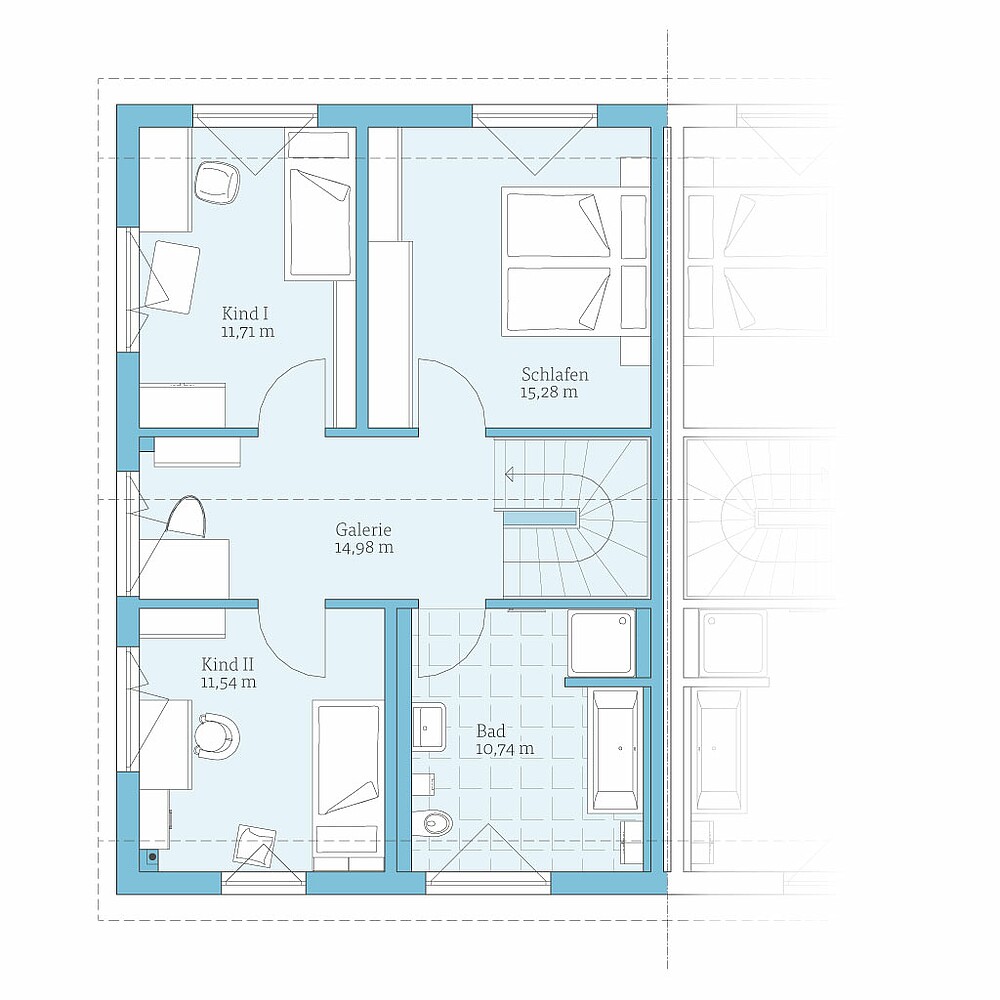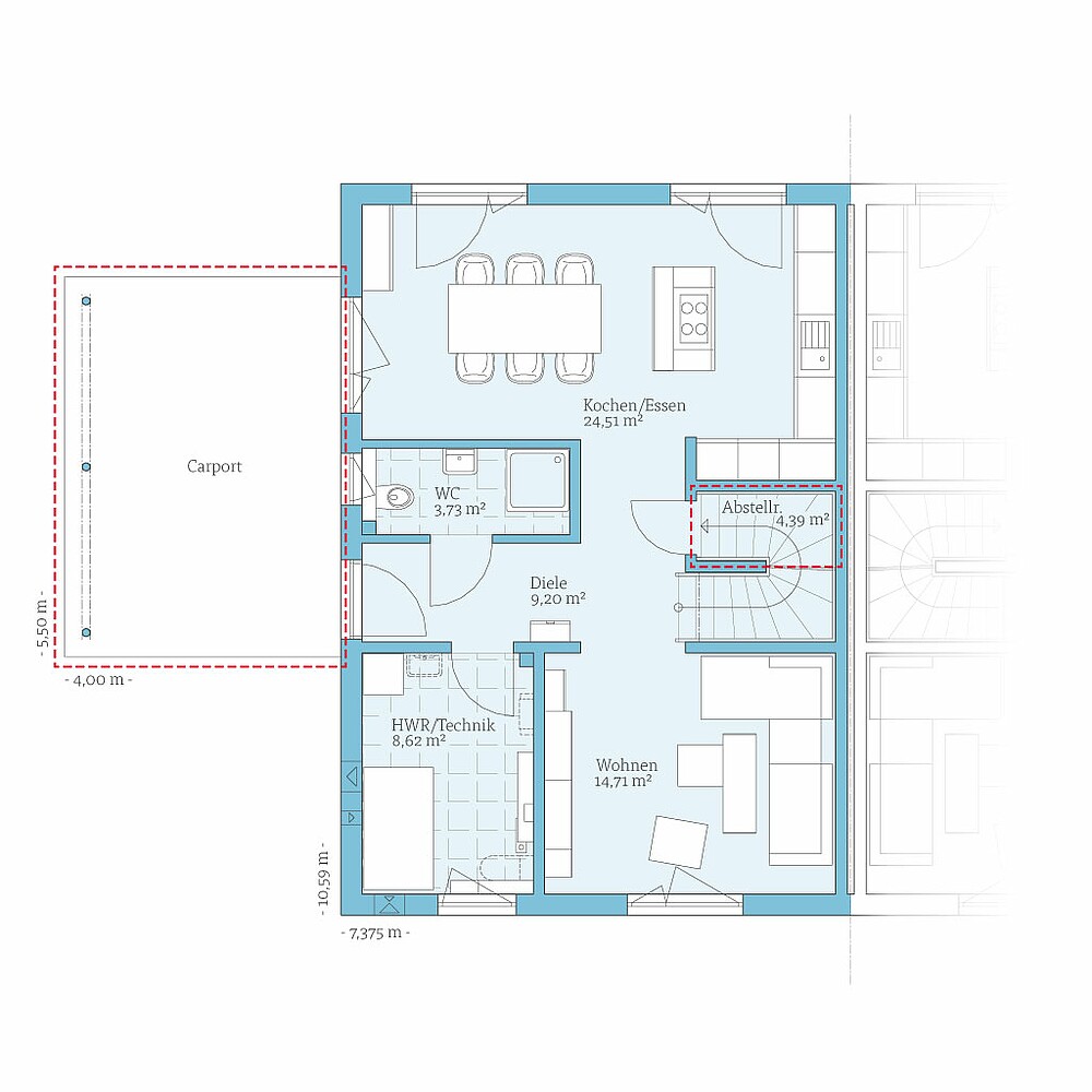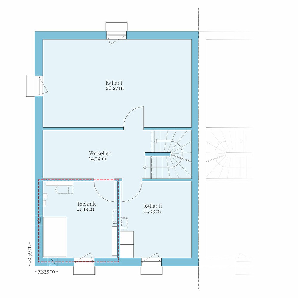 - Optionales Kellergeschoss: Hauswirtschafts- und Technikraum im Keller, dafür Arbeits- oder Gästezimmer im Erdgeschoss