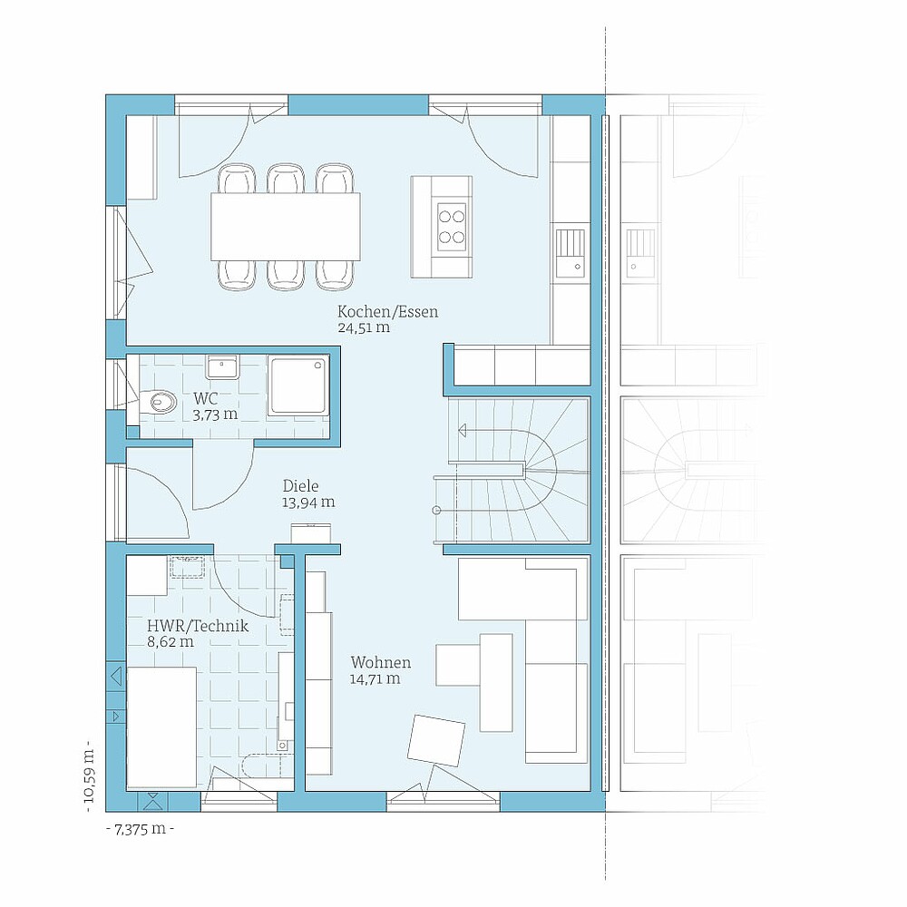Unser Entwurf Doppelhaus 25-129 zeigt, wie das aussehen kann: In den Doppelhaushälften, die perfekt auf den Alltag einer vierköpfigen Familie zugeschnitten sind, ist zum Garten hin eine helle Wohnküche mit Zugang zur Terrasse eingeplant – groß genug für einen Esstisch, an dem Familie und Freunde bequem Platz finden. Das Wohnzimmer liegt offen auf der anderen Seite der Diele. So entsteht ein gemütlicher Rückzugsort, während die beiden Bereiche trotzdem miteinander in Verbindung stehen.