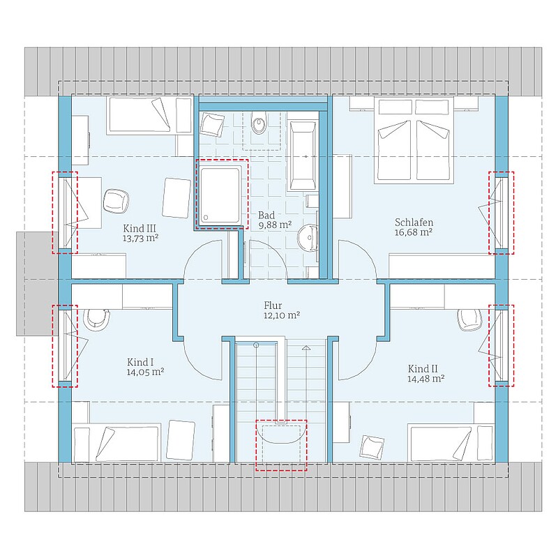 Im Obergeschoss, unter dem 35° geneigten Dach und einem Kniestock von 120 cm, befinden sich drei Kinderzimmer und das Elternschlafzimmer. Große, optional bodentiefe Fenster sorgen für lichtdurchflutete Räume und verstärken das Gefühl von Weite, während der durchdachte Grundriss eine optimale Raumnutzung ermöglicht.