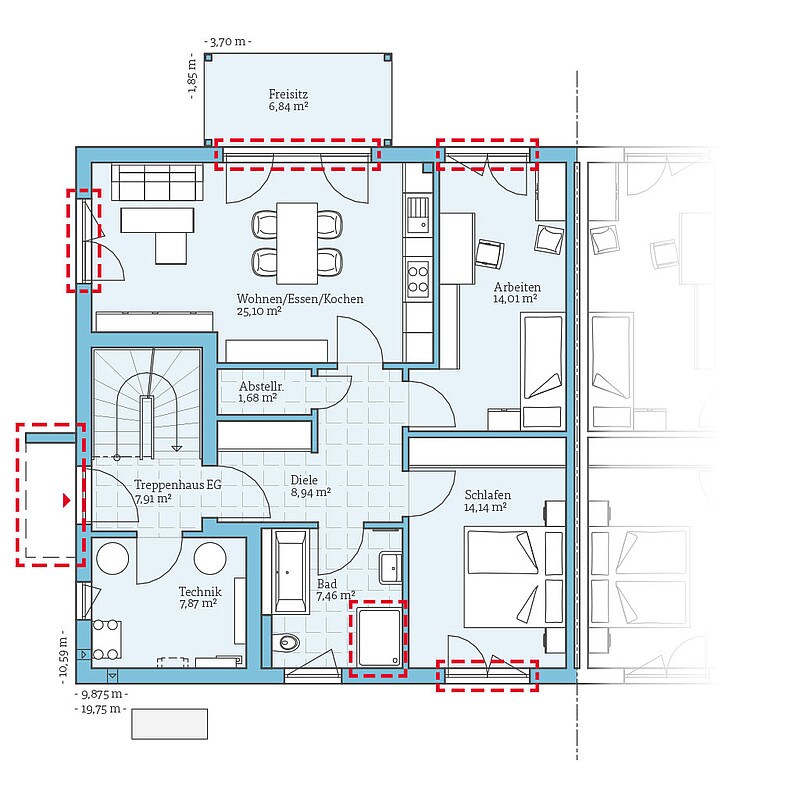 - Terrassentür statt Fenster im Wohn-, Ess- und Kochbereich sowie Arbeits- und Schlafzimmer