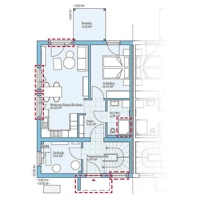 - Größere Fenster im Wohn-, Ess- und Kochbereich sowie Badezimmer