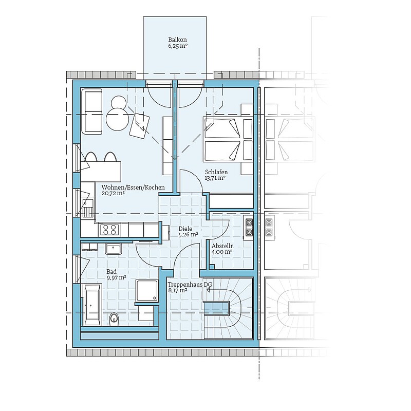 Unten sorgen ein Wohn-, Ess- und Kochbereich, Schlafzimmer, Duschbad und Technikraum für eine funktionale Basis. Oben sorgen Gauben für mehr Raum und Licht. Der Balkon ist vom Wohn- und Schlafzimmer aus erreichbar. Ein Bad mit Wanne und Dusche sowie ein Abstellraum runden die Wohnung ab.