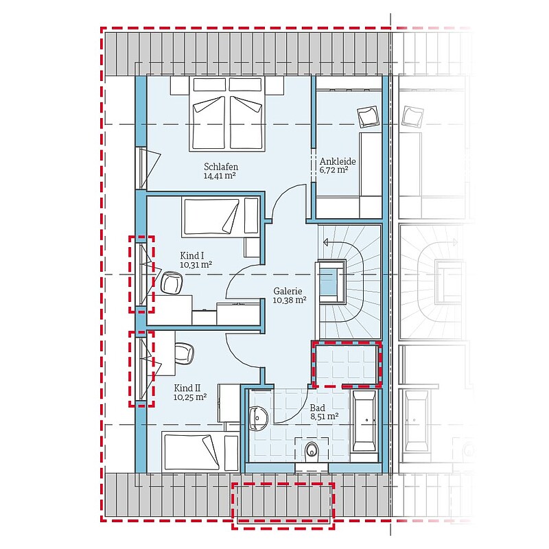 Damit die beiden Kinderzimmer und das Schlafzimmer für ihre Bewohner als gemütliche Rückzugsorte zur Verfügung stehen, ist im ganzen Haus für viel Stauraum gesorgt: In der Diele ist genug Platz für eine Garderobe und einen kleinen Abstellraum – optimal als Speisekammer, für Putzutensilien oder Winterjacken. Optional kann unter der Geschosstreppe noch ein weiterer Abstellraum entstehen. Das Elternschlafzimmer ist mit einer geräumigen Ankleide ausgestattet, in der zum Beispiel auch Bettwäsche und Handtücher gut aufgehoben sind.