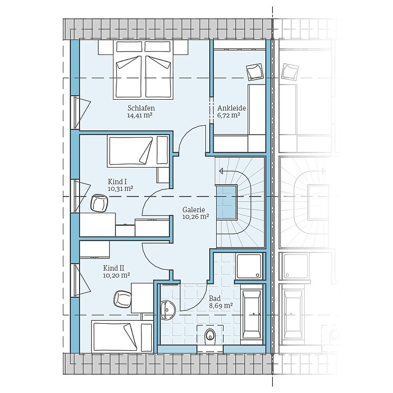 - Größeres Bad, größeres Schlafzimmer und ein größeres Kinderzimmer (statt zwei)