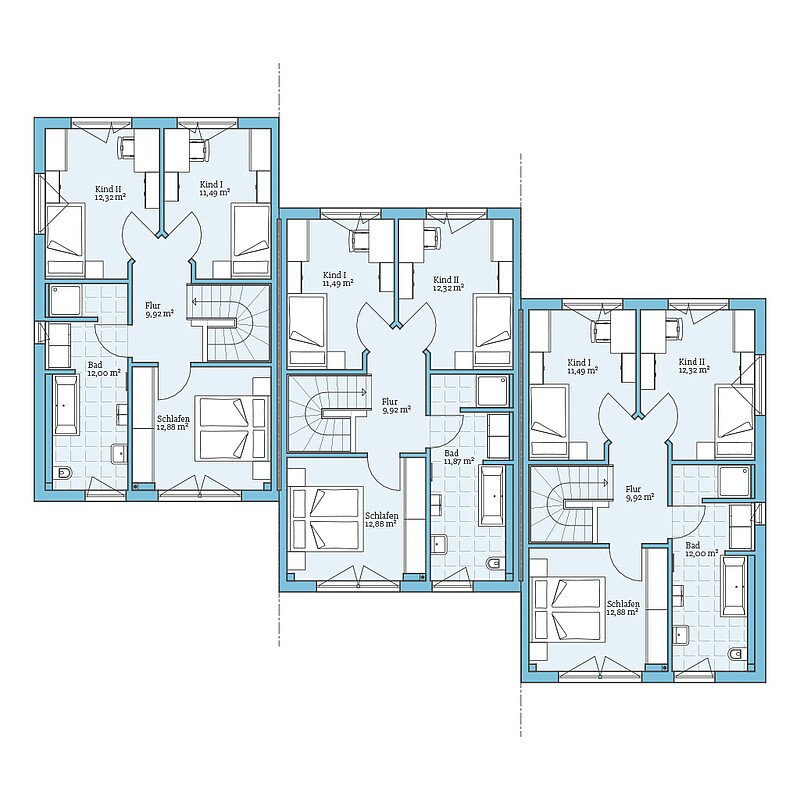Ein grundsätzlicher Unterschied bei Reihenhäusern ist, ob sie in einer geraden Reihe angeordnet werden oder versetzt stehen. So wird das Reihenhaus optimal an die Form der Grundstücke und die Ausrichtung der Straße angepasst. Mit ihren knapp 120 Quadratmetern können die Häuser jeweils bereits auf kleinen Grundstücken ab 300 Quadratmetern umgesetzt werden.