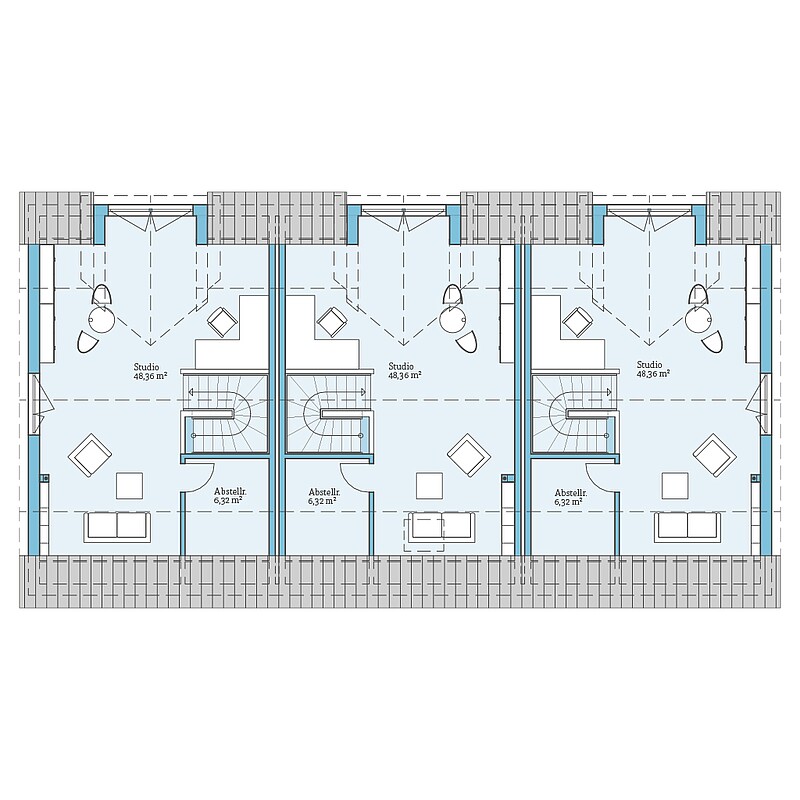 Bei dieser Planungsvariante des Reihenhauses 118 wurde die Dachneigung des Satteldaches erhöht und zur Gartenseite hin ein Zwerchgiebel ergänzt. So entsteht ein zusätzliches Geschoss mit Aufenthaltsräumen und vielseitigen Nutzungsmöglichkeiten. Der Zwerchgiebel sorgt für Kopffreiheit und seine großen Fensterflächen bringen viel Licht für ein weiteres Kinderzimmer, ein Gäste- und Arbeitszimmer oder einen Sport- und Hobbyraum sowie zusätzlichen Stauraum bis unter die Dachschrägen.