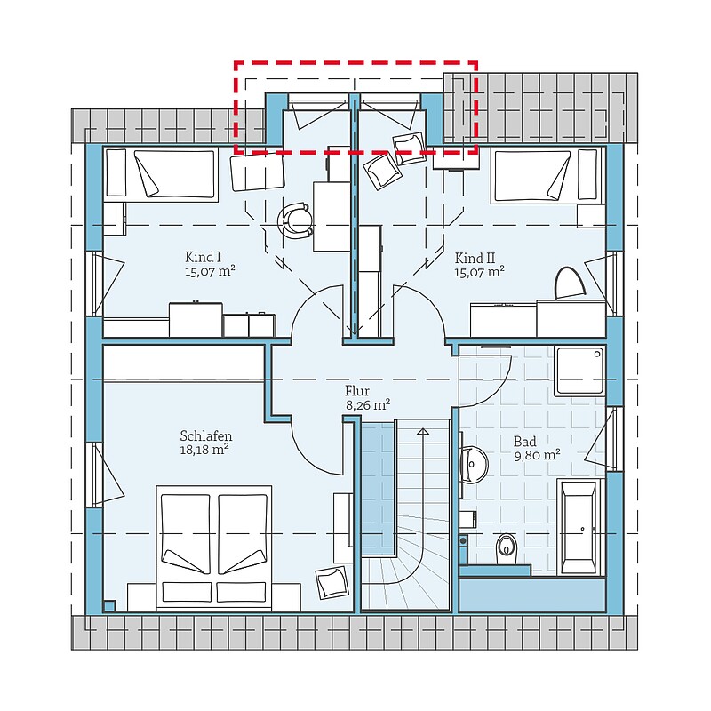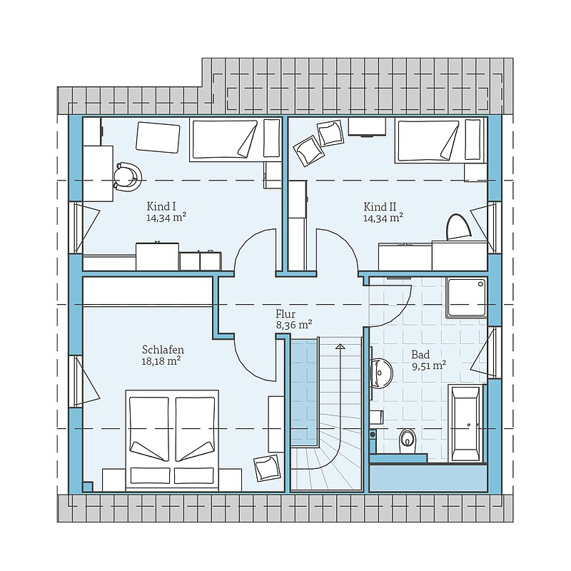 Durch den 120 cm hohen Kniestock dieses Hauses aus unserer Hausserie Variant mit Satteldach ist auch der Raum im Dachgeschoss komfortabel nutzbar. Neben den beiden Kinderzimmern stehen hier noch ein Elternschlafzimmer und das Bad zur Verfügung.