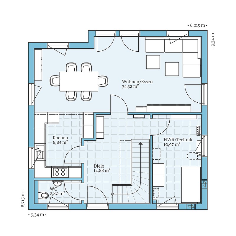 Die funktionelle Aufteilung des Erdgeschosses in einen offenen Wohn-, Ess- und Kochbereich, den geräumigen Eingangsbereich, ein Gäste-WC und den praktischen Hauswirtschaftsraum ist voll und ganz auf Alltagstauglichkeit ausgerichtet.
