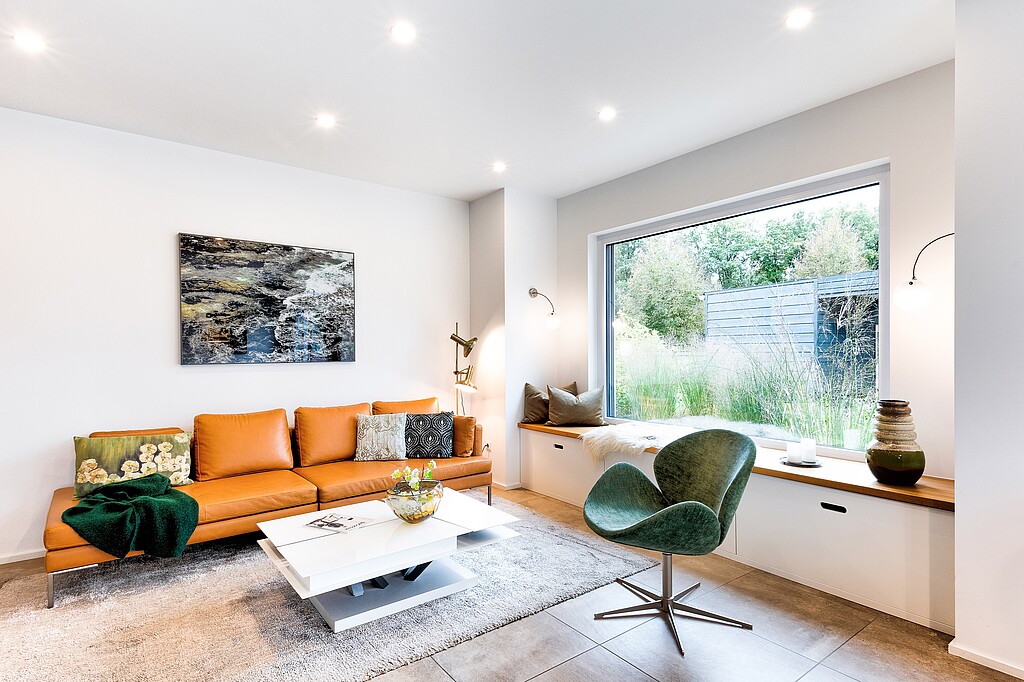 Reiner, weißer Putz strahlt in Kombination mit dunkel- und hellgrauen Farbflächen Stilsicherheit aus. Einen spannenden und dennoch ganz natürlichen Kontrast schafft die Sandsteinfassade am Zwerchgiebel. Große Glasflächen fangen das Tageslicht ein und lassen im Haus eine angenehme Wohlfühl-Atmosphäre entstehen.
