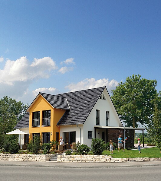 Im modernen Pultdach-Haus Vita 209 mit L-förmigem Grundriss ist eine Einliegerwohnung untergebracht. Das Variant 35-176 mit Satteldach und Keller bietet auf 225 m² Wohnfläche viel Platz zum Wohnen und Arbeiten.