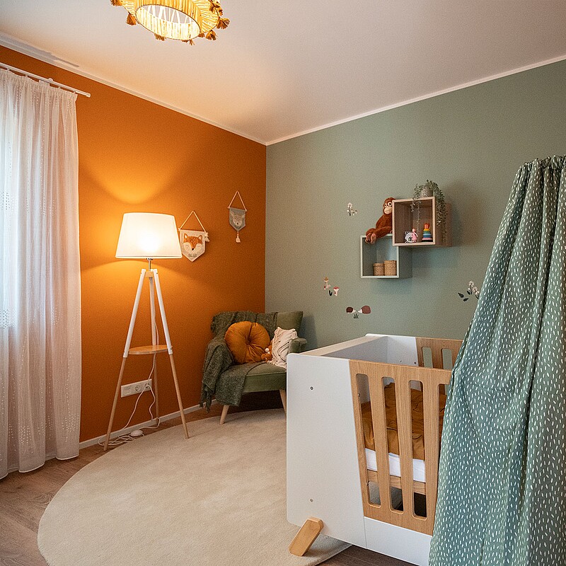 Der offene Wohn-, Ess- und Kochbereich wird durch einen großflächig verglasten Erker erweitert, der dort eine ganz besondere Atmosphäre schafft und ein Stück Natur ins Haus holt. Ein Stockwerk höher befinden sich das Bad und die Schlafräume – ganz gemütlich unter Dachschrägen.