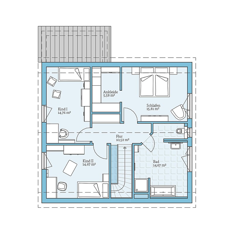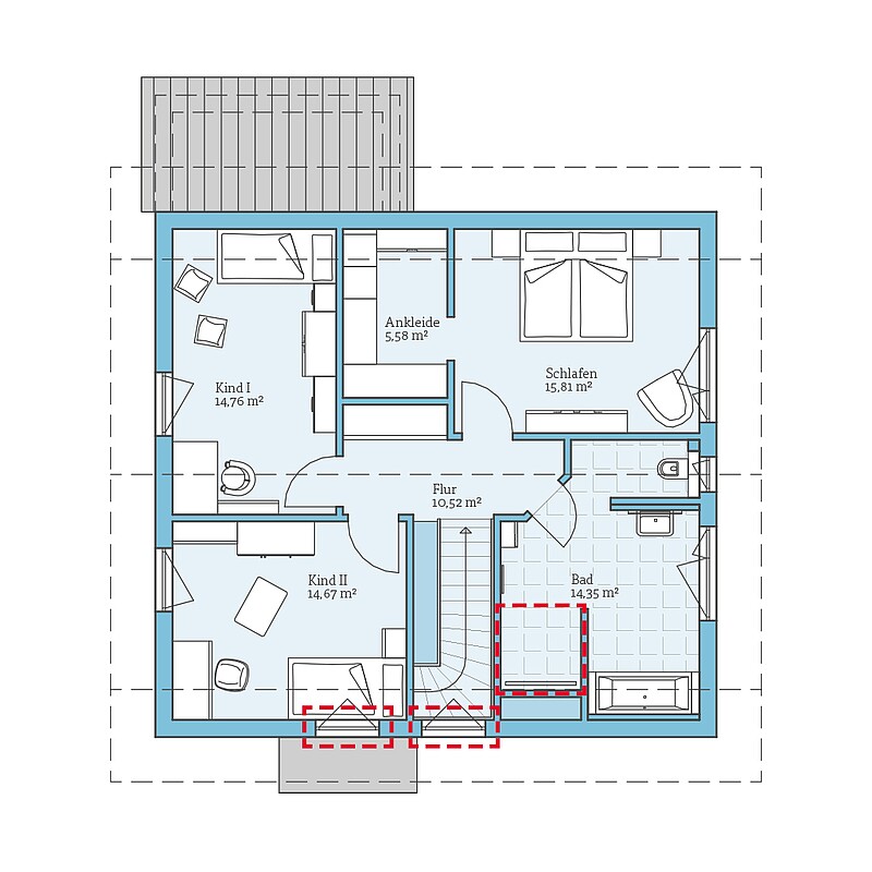 Durch das flache Satteldach mit einer Dachneigung von 25° und den 200 cm hohen Kniestock entsteht in dem modernen Einfamilienhaus ein besonders geräumiges Dachgeschoss: