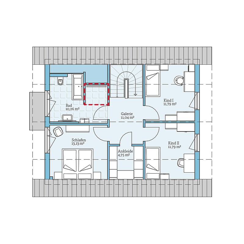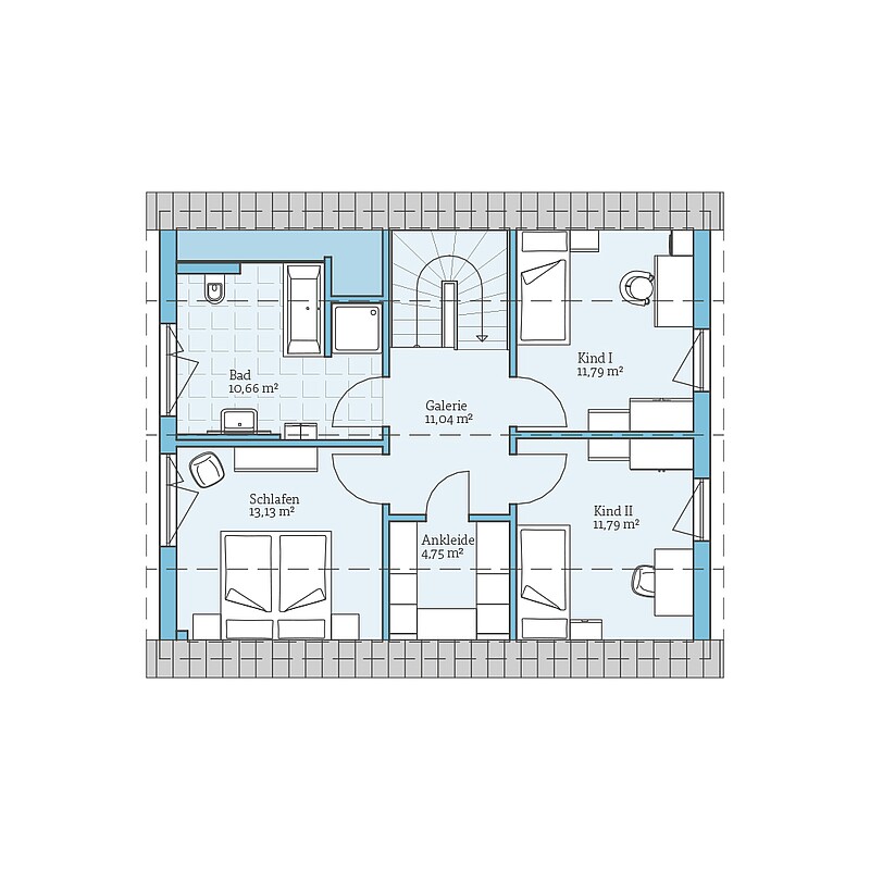 Im Dachgeschoss unter dem Satteldach mit 38° Dachneigung und einem Kniestock von 120 cm findet jedes Familienmitglied seinen Rückzugsort.