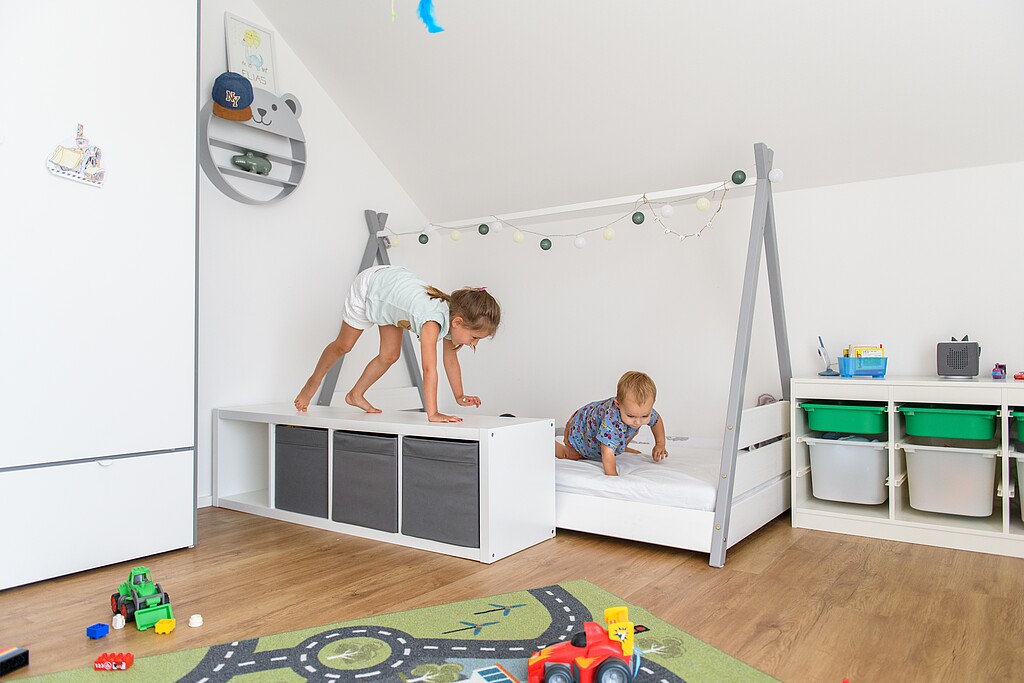Im Dachgeschoss findet man das Elternschlafzimmer mit separatem Ankleideraum, die beiden Kinderzimmer und einen praktischen Hauswirtschaftsraum direkt neben dem großen Familienbad, der für einen kurzen Weg der Wäsche sorgt.