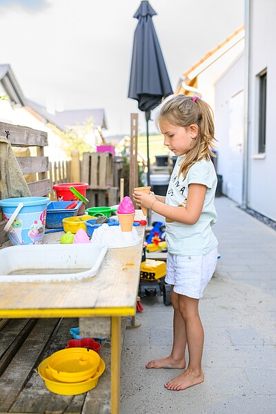 In ihrem Garten haben sie sich eine eigene Wohlfühloase geschaffen, in der die Kinder genug Platz zum Spielen haben, während sich die Eltern in der Sonne entspannen können.