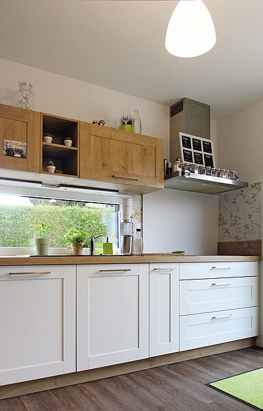 The clients decided on a combination of a gas condensing boiler, a ventilation system and a solar heating system. An ideal addition to this is the fireplace in the living area. Although it provides pleasant warmth and a lovely atmosphere even in the dead of winter, it is so popular with the owners that they can basically turn off the underfloor heating all year round in the living area, the hallway and the kitchen. Thanks to the heat recovery of the ventilation system, the heat of the fireplace is transferred to the incoming fresh air.
