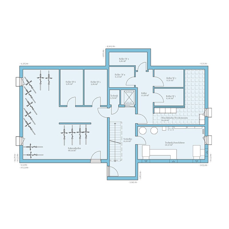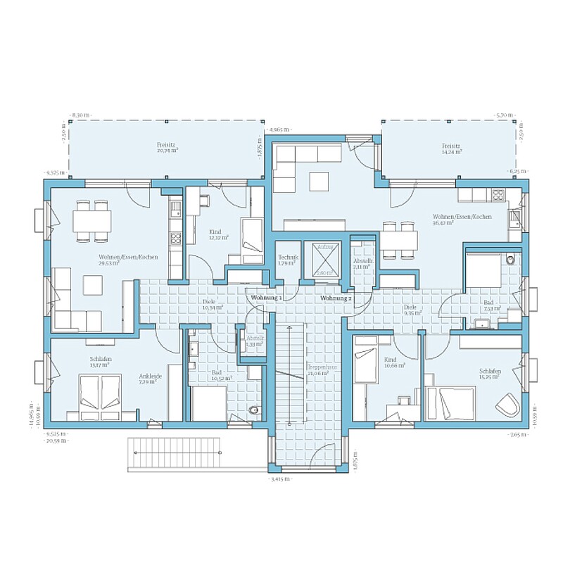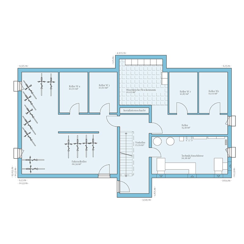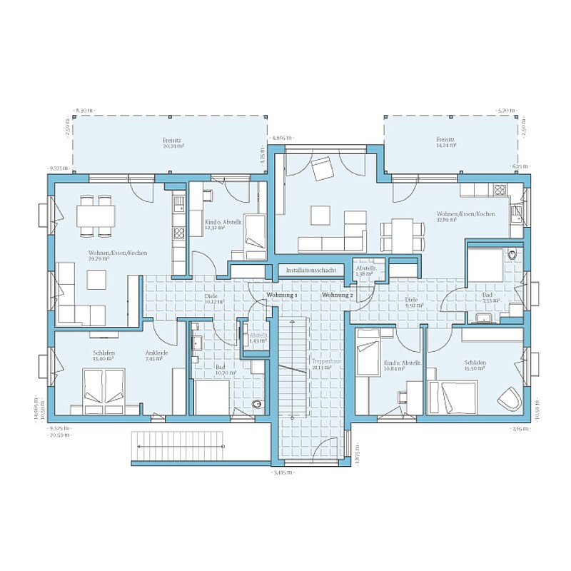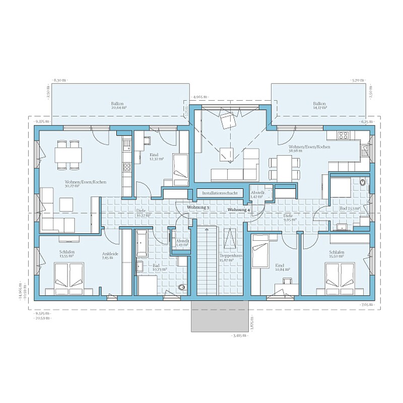 How do you find the perfect floor plan for a modern multi-family house? First of all, it depends on how many residential units are to be accommodated under one roof, how large they are to be and who will be living in them. Here we show you cleverly planned floor plans for multi-family houses with three, four or six residential units that are suitable for everyday use and that our Hanse Haus architects have designed for you. In addition to practical planning details, our multi-family house floor plans offer plenty of living comfort and many different usage options. The floor plans of our multi-family house floor plans are sorted by the number of residential units in ascending order: 4-family house floor plans and 6-family house floor plans.