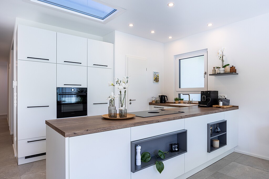 The bungalow inspires with its bright and light-flooded rooms. Thanks to the daylight spot in the hallway and the two ceiling windows, which are installed in the kitchen and bathroom, a lot of natural daylight enters the house. With the ceiling windows, you can enjoy the view of the sky at any time.