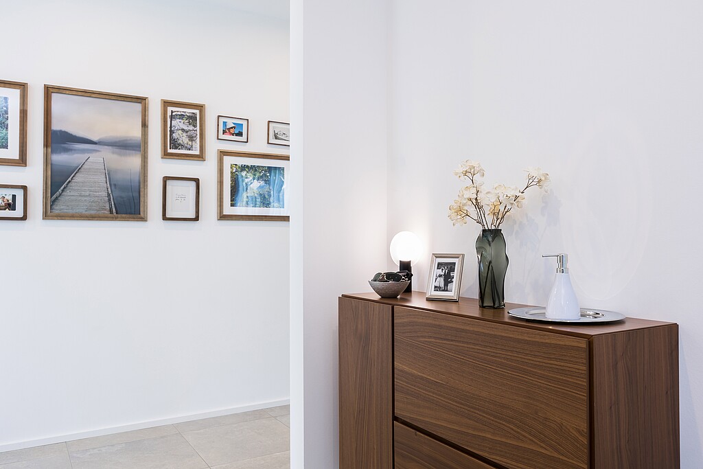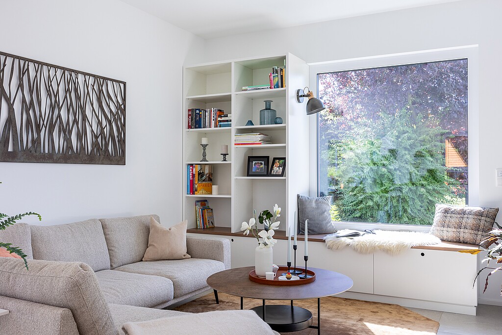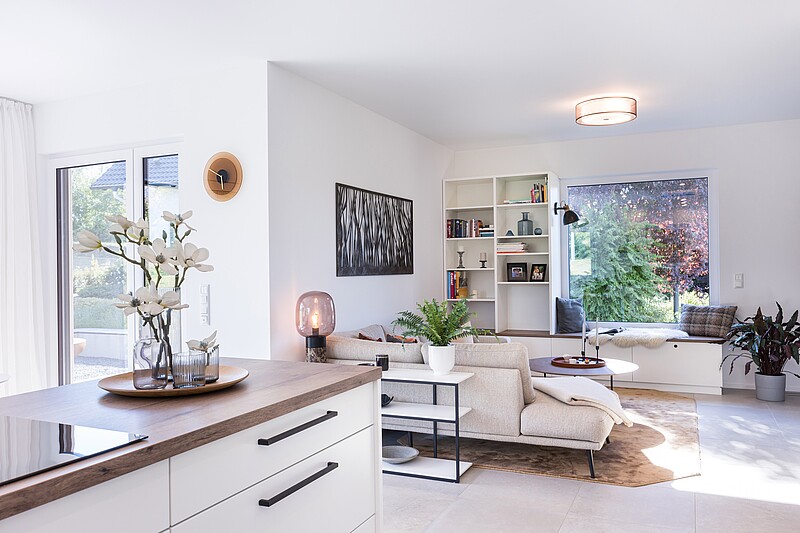 The covered outdoor seating area with wooden boarding and the window seat in the living room create a great feeling of space. With the air-water heat pump and a photovoltaic system, the show house achieves the KfW 40 Plus standard.