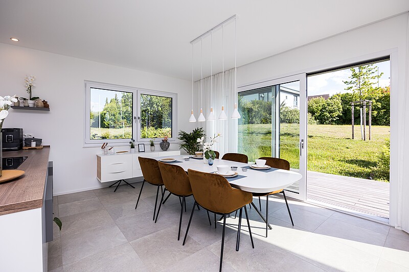 The spacious, light-drenched living, dining and kitchen area, a separate guest toilet and the large bathroom in the loft offer pleasant living comfort and make the house a place of well-being for a family of up to four. The utility/heating system room on the ground floor makes it possible to save money by building this model without a basement.